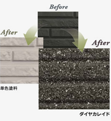 ダイヤカレイドとは水系シリコン系微光沢多彩規模塗料であり、特殊カラーフレークの使用により従来の単色塗料にはない立体感と深みがある豪華な彩を演出します。